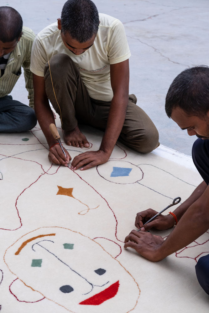 nanimarquina introduces the embroidery on kilim technique for the first time, a laborious process handmade in Pakistan where the chain stitch embroidery adds texture and a soft volume that emphasizes the sinuousness of the illustration. Despite its delicate appearance, it is a sturdy technique suitable for both residential and commercial use. Available in two standard sizes, the indoor model also includes a tapestry piece that can be hung vertically.