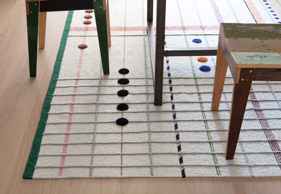 “We decided to create a series of rugs that evoke the sensual and shiny world of tribal folk embroidery of India. We wanted our collection for nanimarquina to reference the unfinished embroideries like studies of different techniques in progress, as they gradually emerge over time. The spontaneous compositions of the rugs embody the serendipity and freedom to improvise inherent in each step of a handmade piece. Joyful, irreverent and unique.” Doshi Levien